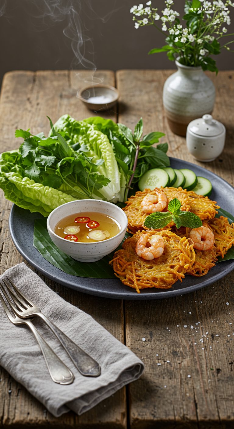 To serve, set out the warm fritters, lettuce leaves, herbs, and cucumber. Nestle a fritter in a lettuce leaf, add herbs and a cucumber slice, then dunk generously in nuoc cham. Eat immediately while the fritters are still shatter-crisp.