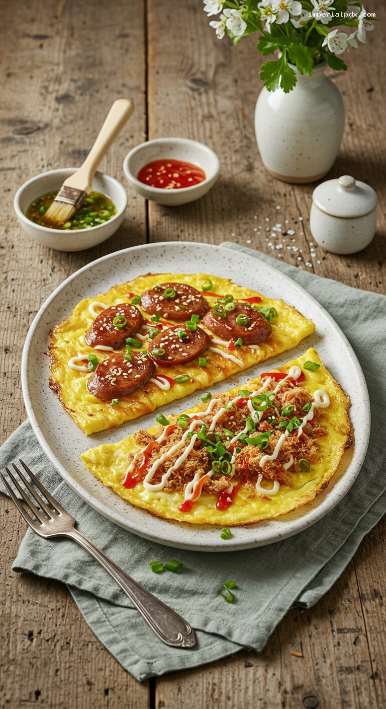 - 5) Pour 2.5 tbsp egg over rice paper; quickly spread thinly. Scatter sausage (or 2 tbsp pork floss), 1 tbsp green onion, and 1/2–1 tsp Sriracha; add 1 tsp Kewpie and a pinch of shallots/sesame if using.