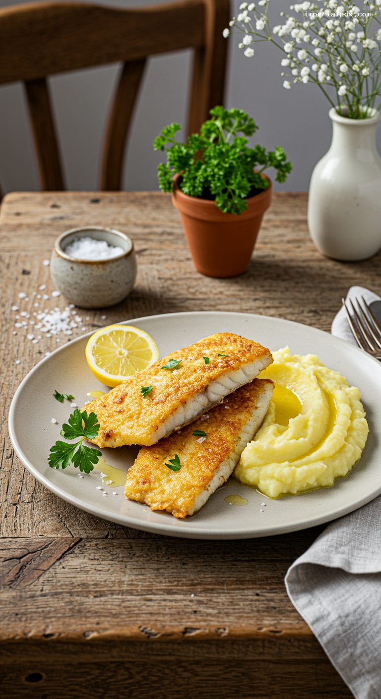 Spoon a generous mound of puré onto warm plates, creating soft swirls. Nestle a crisp hake fillet alongside. Shower the fish with a touch more flaky sea salt, a squeeze of fresh lemon, and a scatter of parsley. Serve immediately while the coating is at peak crunch.