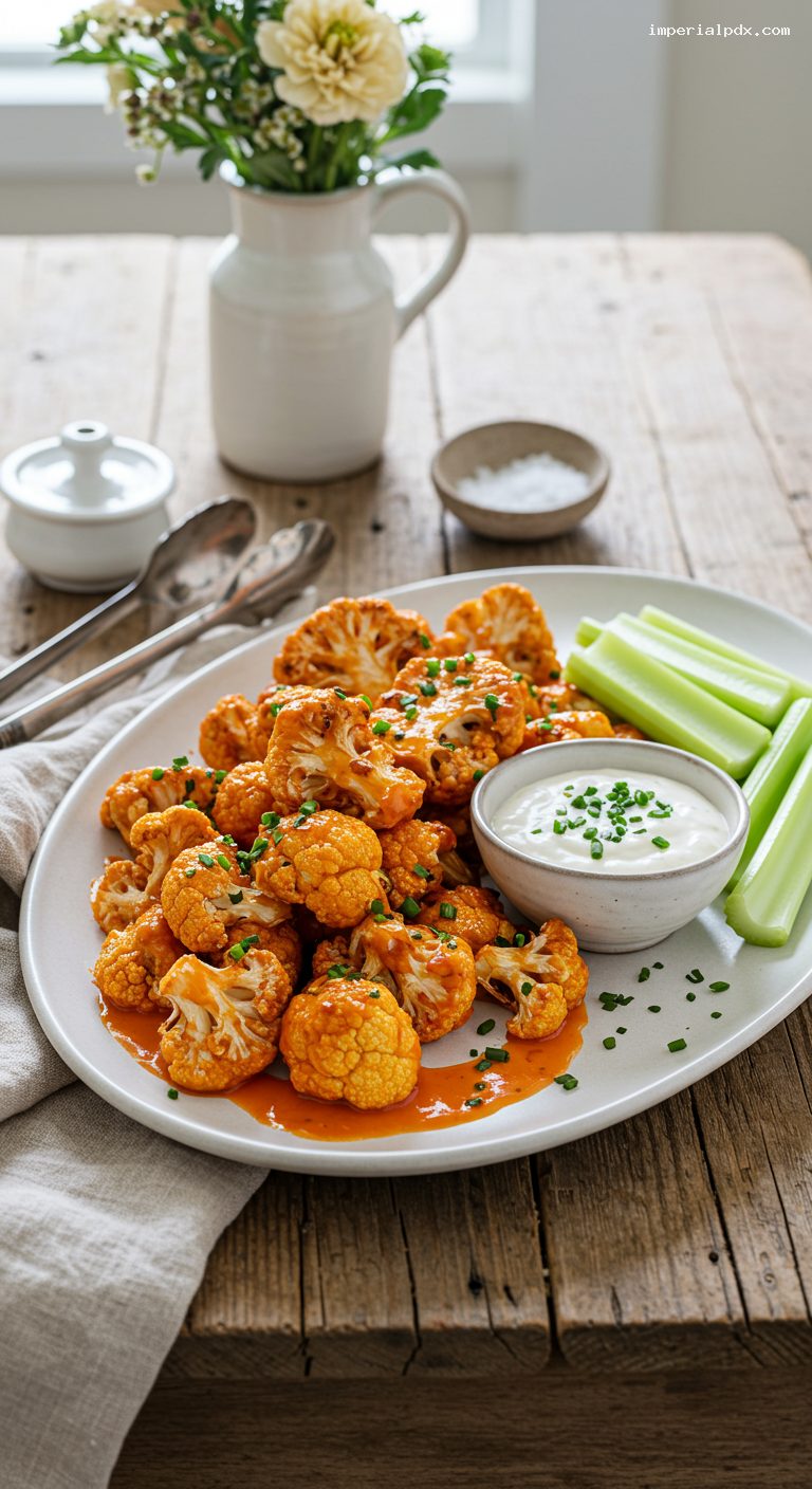 Transfer the Buffalo cauliflower to a platter. Sprinkle with chopped chives or parsley. Serve immediately with a ramekin of cool ranch and crisp celery sticks on the side.
