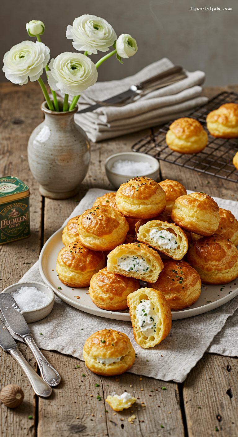 Remove the sheets from the oven. Use a skewer to poke a small hole in the side or bottom of each puff to release steam. Turn the oven off, crack the door, and return the trays for 5 minutes to dry the interiors. Serve warm and crisp. For filled gougères, split horizontally and add a teaspoon of whipped goat cheese, salmon crème, or tapenade. Replace the top and serve immediately.