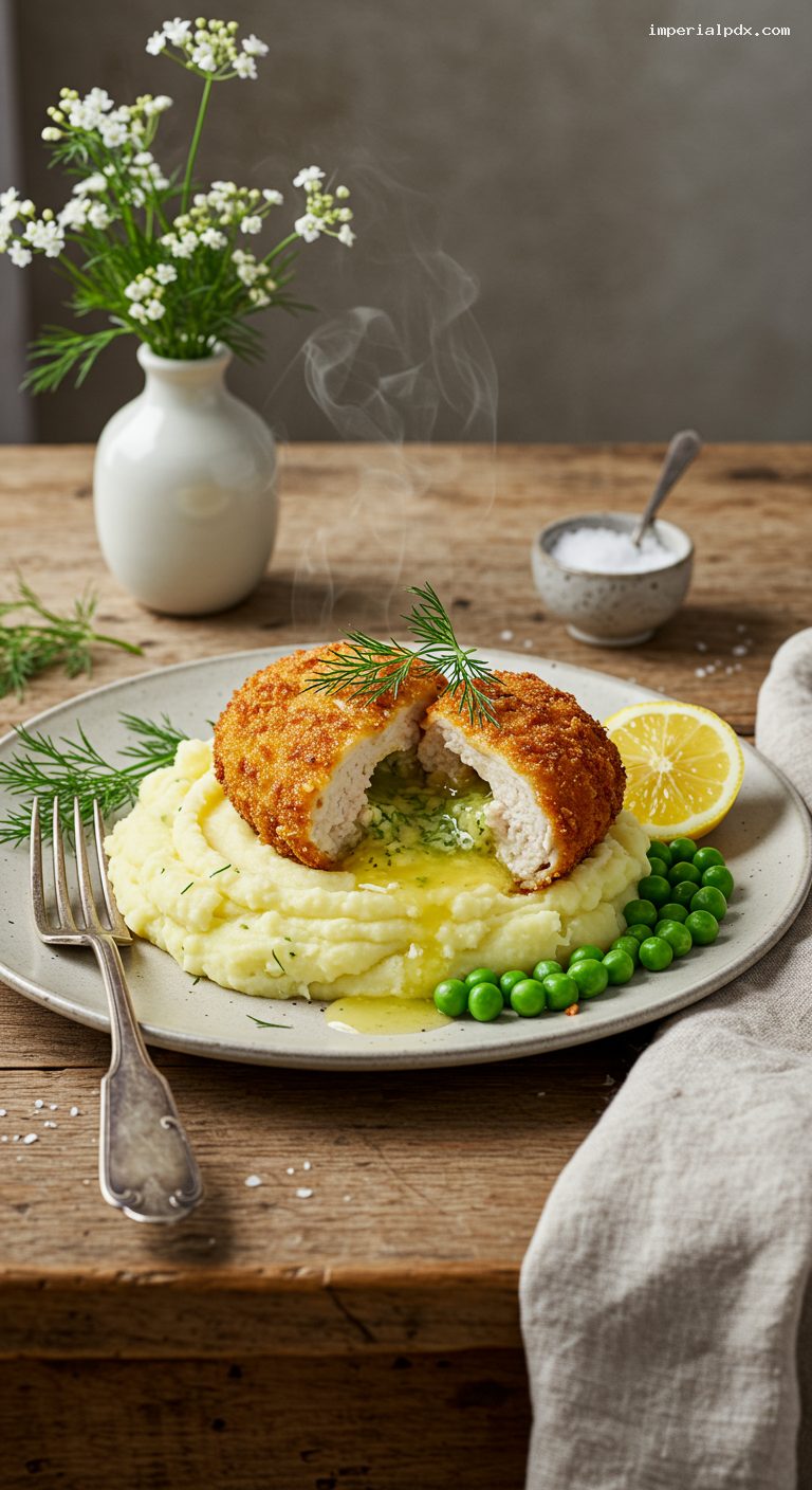 Move the rack and sheet pan to the 375°F oven. Bake until the thickest part of the chicken reaches 165°F, 12–15 minutes. Rest 5 minutes to let juices settle and butter calm slightly. Serve each Chicken Kiev over a bed of hot mashed potatoes with a side of buttered peas. Slice the top open so the dill–garlic butter cascades over the potatoes. Garnish with extra dill and a squeeze of lemon.
