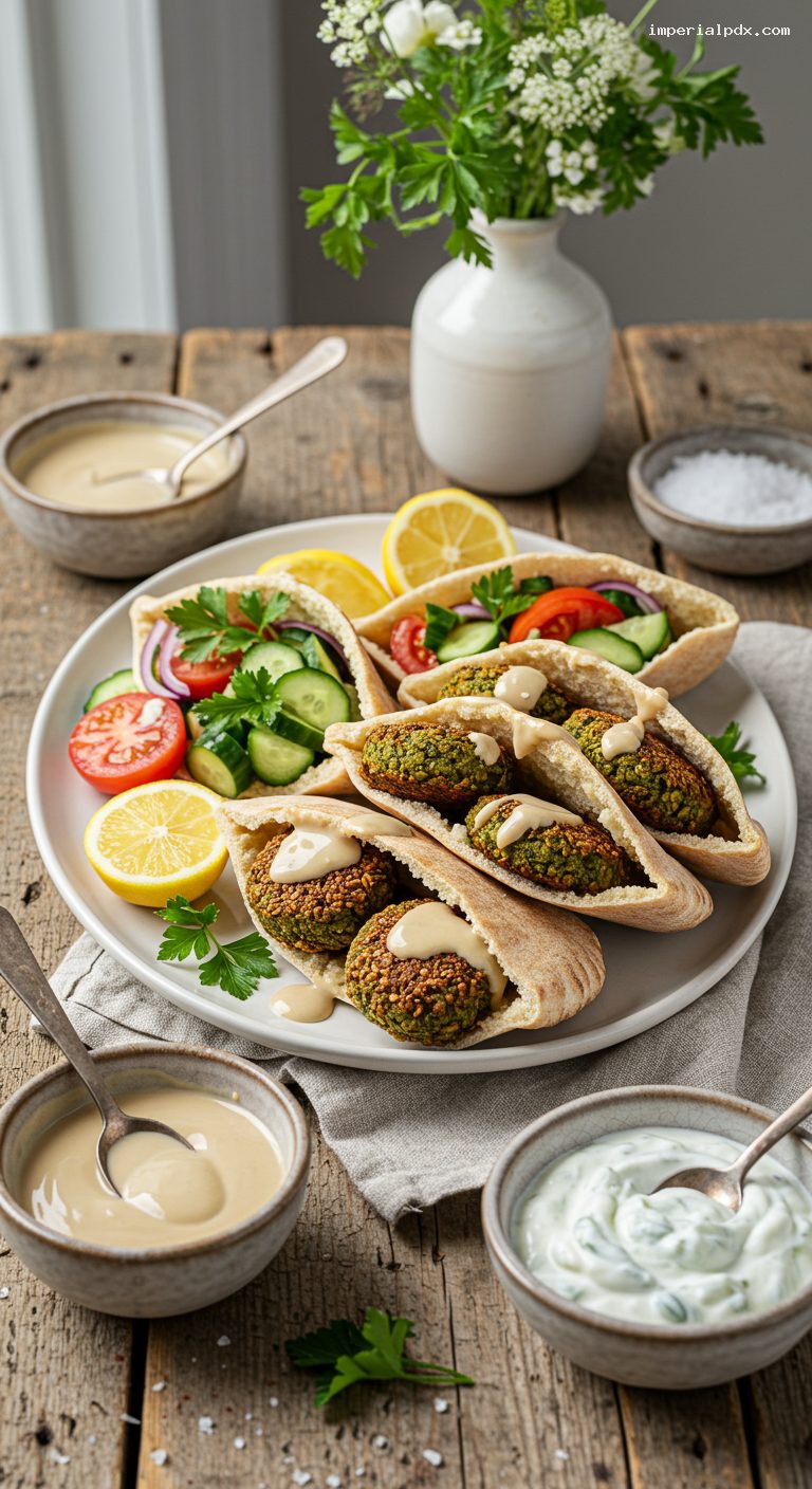 - 6. Warm pitas, slice tomato/cucumber/red onion, whisk tahini (or make tzatziki); assemble pockets and serve.