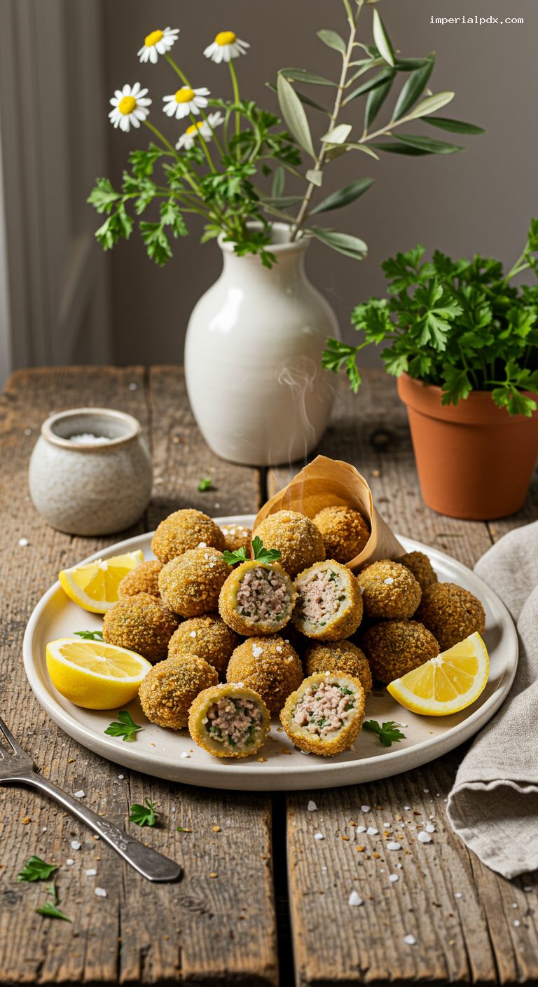 Assemble and bread up to 24 hours ahead; keep covered and refrigerated. For longer storage, freeze breaded, uncooked olives on a tray until solid, then transfer to a freezer bag for up to 1 month. Fry from frozen at 350°F/175°C for 4–5 minutes. Leftover fried olives keep 2–3 days in the refrigerator; re-crisp on a wire rack at 375°F/190°C for 8–10 minutes. Always serve hot with fresh lemon.
