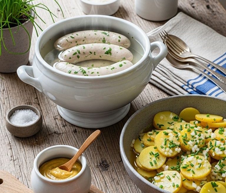 - 1. Parboil potatoes in salted water with bay leaf for 8–10 minutes until just tender; drain, steam-dry, cool 10–15 minutes. Peel and slice into 5–7 mm rounds.