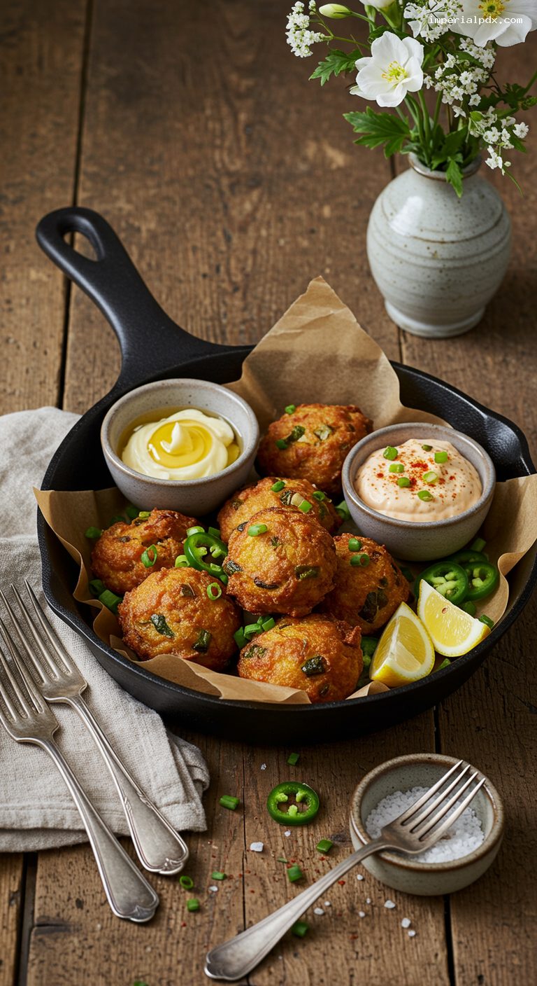 For the honey butter, stir together the softened butter, honey, and a pinch of salt until smooth and glossy. For the remoulade, whisk together mayonnaise, Dijon, lemon juice, capers, paprika, hot sauce, garlic, and scallion greens; season to taste with salt and pepper. Serve the hushpuppies piping hot with both sauces. Garnish with extra scallions and a few thin jalapeño rounds if desired.