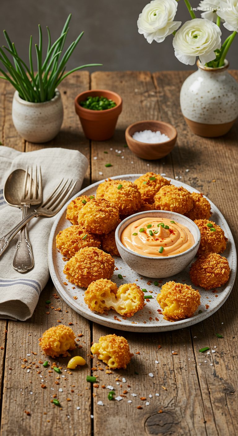 Arrange the hot bites on a platter with the smoky sriracha-mayo on the side. Sprinkle the bites with snipped chives or parsley and a tiny pinch of flaky sea salt. Serve immediately while the centers are creamy and the crusts are crisp.