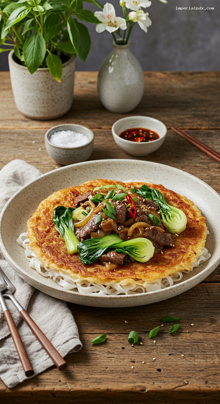 Arrange the crisped noodles on a wide platter or individual shallow bowls. Spoon the beef-bok choy gravy generously over the noodles, allowing some crisp edges to peek out. Garnish with scallion greens and extra black pepper. Serve immediately while the contrast of crisp noodles and saucy topping is at its best.