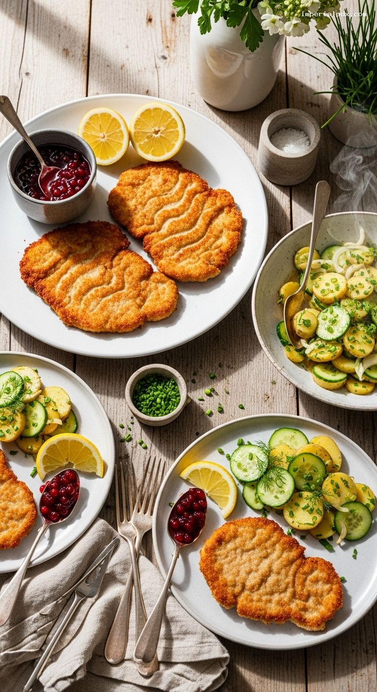 - Balanced plate: warm-fried schnitzel meets cool, tangy potato–cucumber salad.