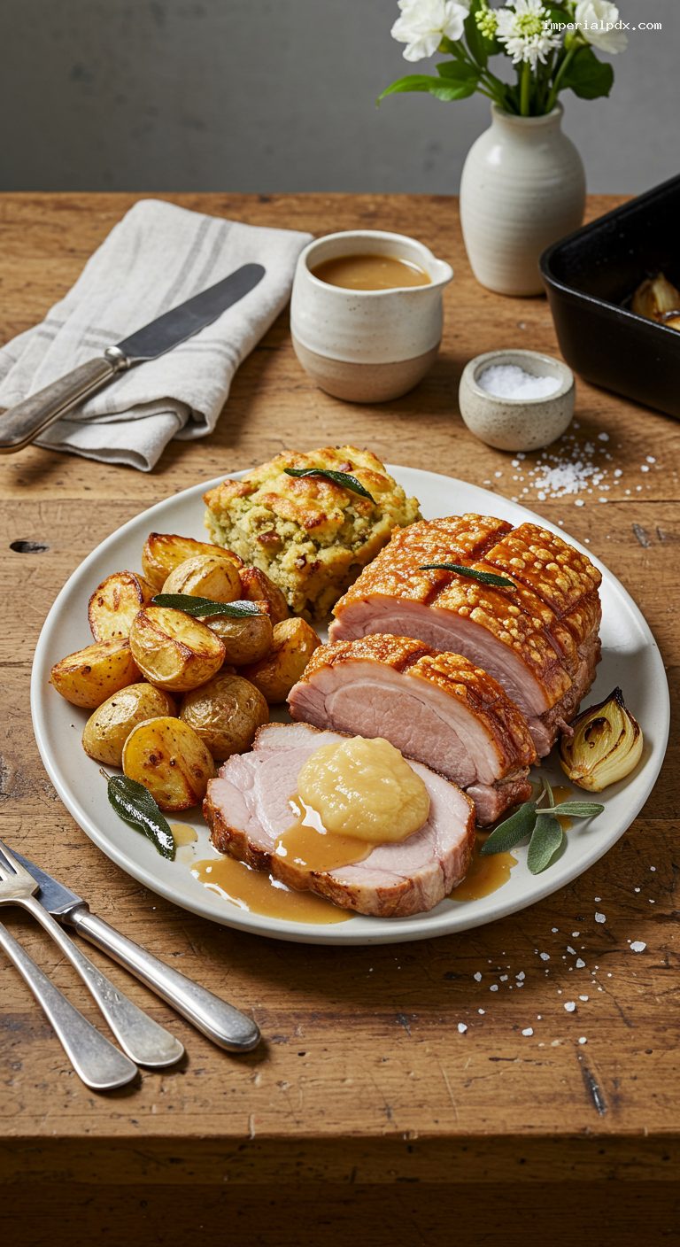 Carve the pork into thick slices, serve with shards of crackling, a mound of golden roast potatoes, generous spoonfuls of sage-and-onion stuffing, a quenelle of apple sauce, and plenty of cider-and-onion gravy. Garnish with fresh sage leaves and a sprinkle of flaky sea salt.
