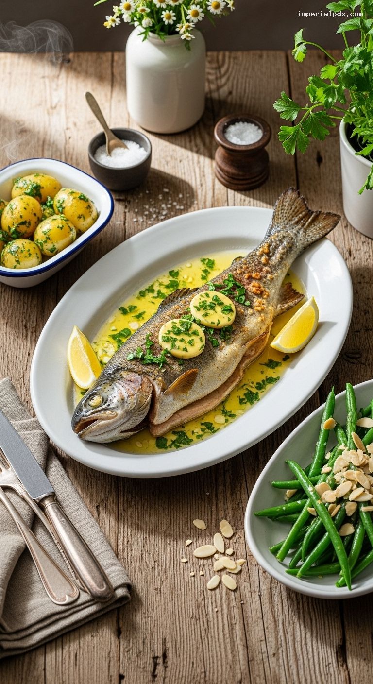 - Balanced plate: buttery trout, bright lemon-parsley finish, tender potatoes, and crunchy almond green beans.