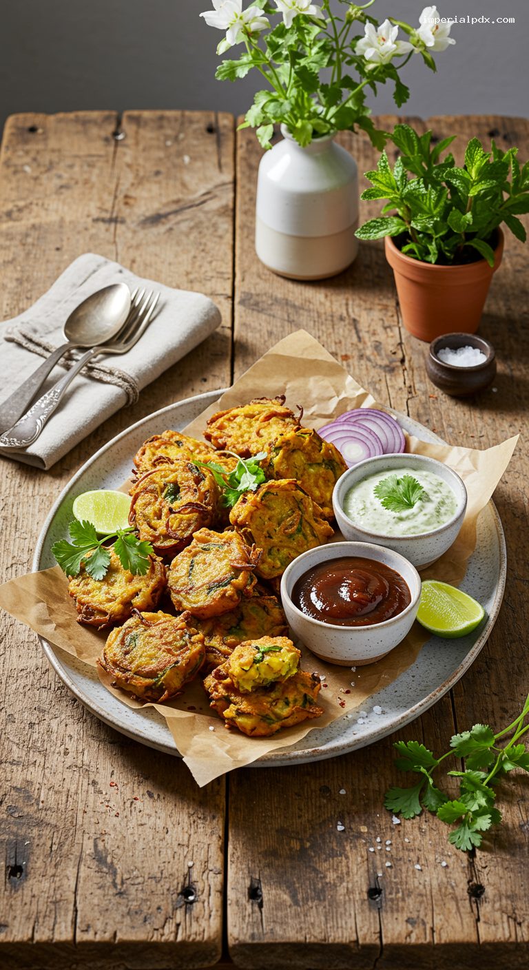 Best eaten fresh and hot. The tamarind chutney keeps 2 weeks refrigerated; the cilantro-mint chutney keeps 3 days (or freeze in portions up to 1 month). Mix the dry batter ingredients ahead and store airtight for 1 month; add water, lemon, and baking soda just before frying. Leftover pakoras: refrigerate up to 2 days or freeze up to 1 month. Re-crisp at 400°F (200°C) for 8–10 minutes (5–7 minutes from frozen) or air-fry at 380°F (193°C) for 4–6 minutes.