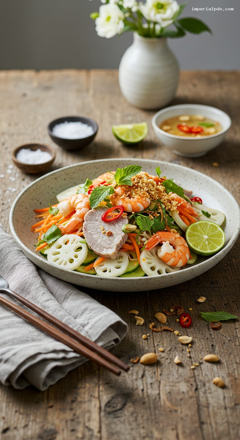 - Produce: Lotus stems, carrot, red onion, Persian cucumber, rau ram (Vietnamese coriander), mint (optional), limes, garlic, Thai bird chilies