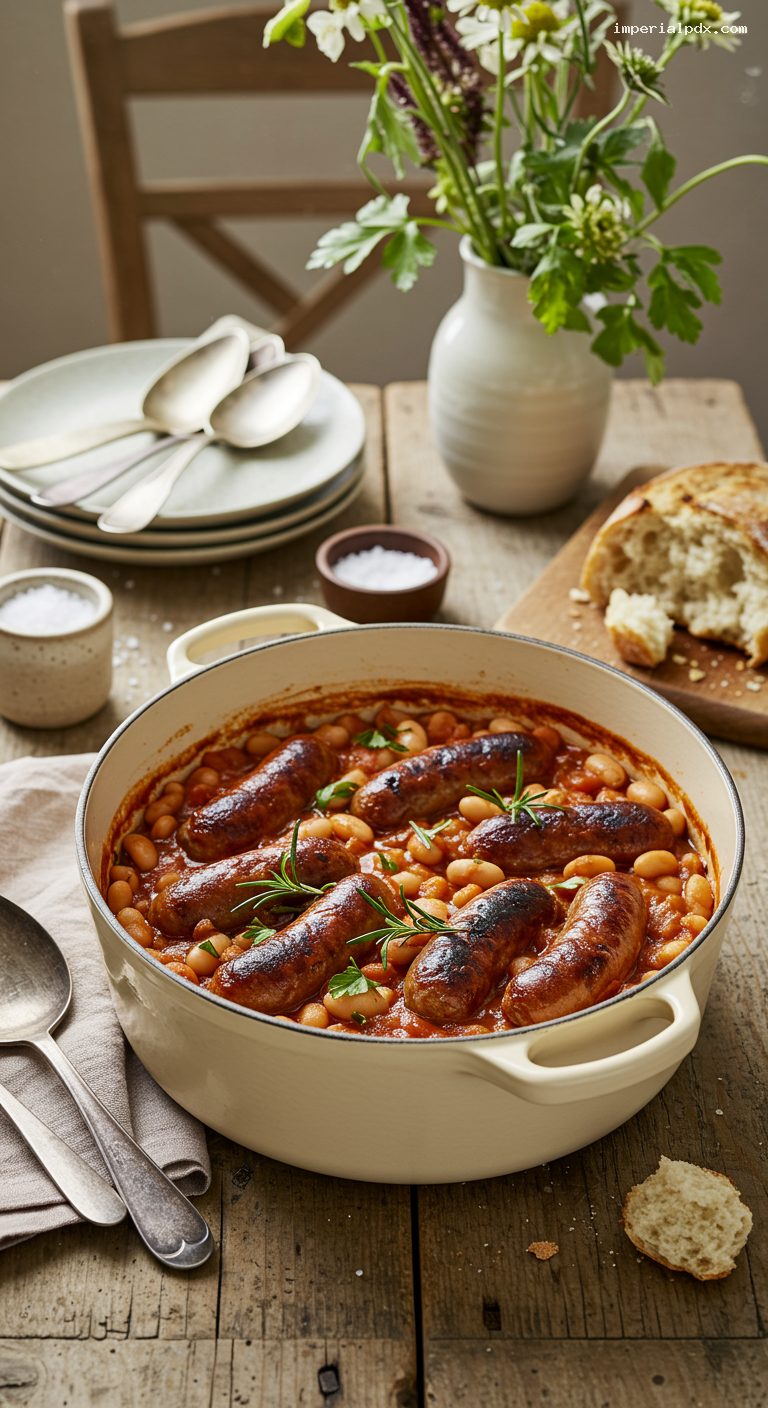 Cover the pot with a lid and bake for 30 minutes. Uncover and continue baking for 20–25 minutes, until the sauce is thick, glossy, and clings to the beans and sausages. If the top needs extra color, you can move the pot to the upper third of the oven for the final 5 minutes. The casserole should be bubbling and smell deeply savory with rosemary.