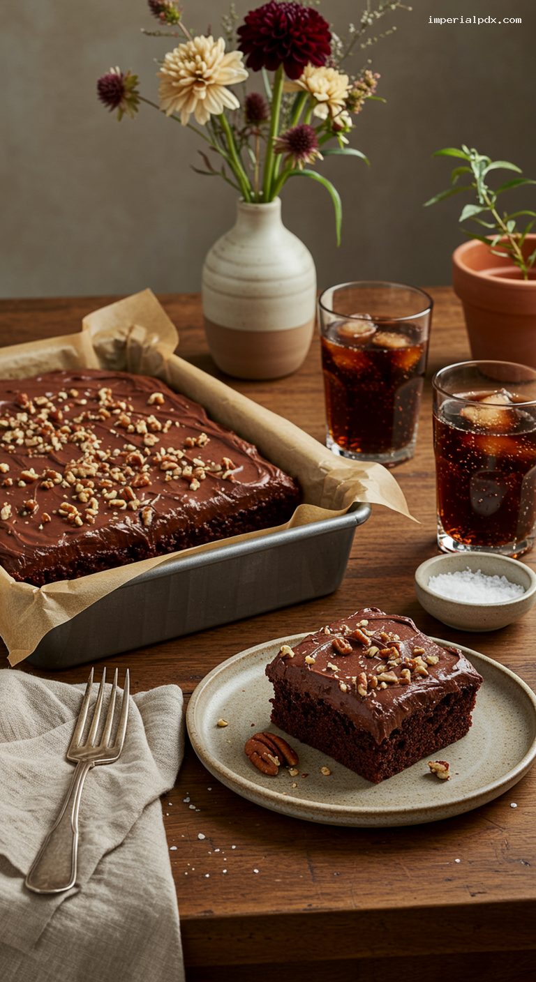 - Pantry: All-purpose flour, granulated sugar, light brown sugar, unsweetened cocoa powder, baking soda, baking powder, fine salt, vanilla extract, neutral oil, powdered sugar, Dr Pepper (not diet), Texas pecans