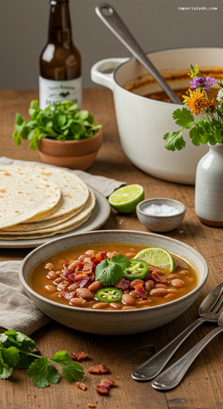 - Classic border-town comfort: smoky bacon, mellow beer, and tender pintos in a richly seasoned broth.