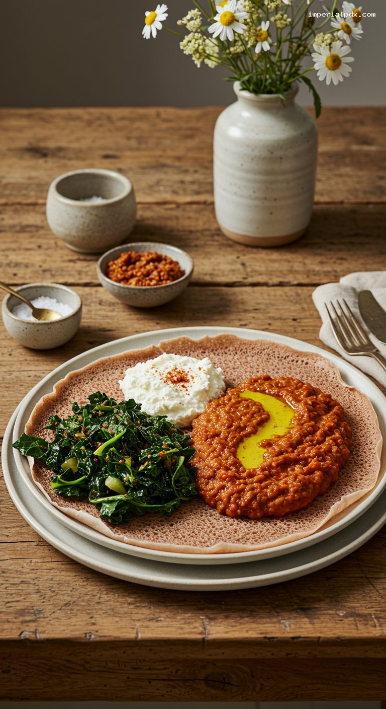 - A complete Ethiopian-inspired platter: injera, cooling ayib, and garlicky sautéed greens.