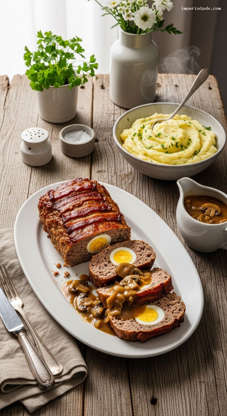 Slice the meatloaf into 1/2-inch (1.25 cm) thick slices, revealing the hard-boiled egg centers. Serve with generous spoonfuls of the mushroom–onion gravy and mounds of creamy mashed potatoes. Garnish with extra parsley if you like.