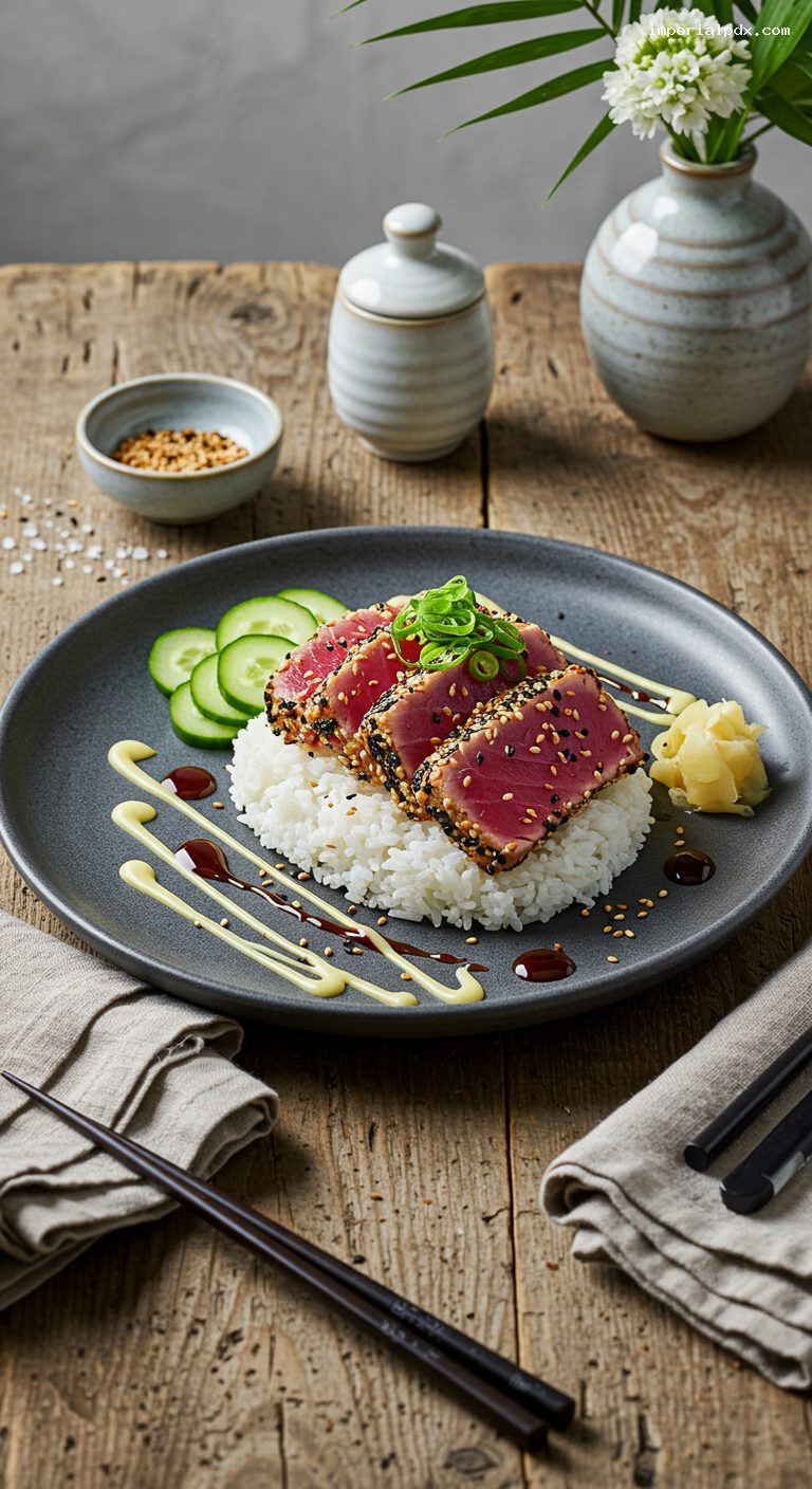 Best enjoyed immediately after searing. Leftover seared tuna (rare) can be covered and refrigerated up to 24 hours; serve chilled or gently bring to cool room temperature—avoid reheating to prevent overcooking. Shoyu reduction keeps in the fridge up to 2 weeks; rewarm briefly if too thick. Wasabi-mayo keeps 3 days chilled. Quick pickled cucumbers keep 3–5 days in their brine. Cooked rice is best same day; if storing, refrigerate up to 2 days and reheat covered with a splash of water.