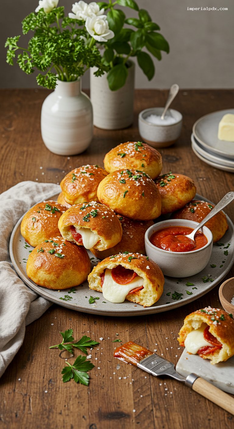 Spoon 1 teaspoon pizza sauce into the center of each round. Add 3 mini pepperoni (or 2 halves of regular pepperoni) and top with one mozzarella cube. Bring the edges up and over the filling, pinch tightly to seal, then gently roll into a smooth ball. Place seam-side down on the prepared sheet.
