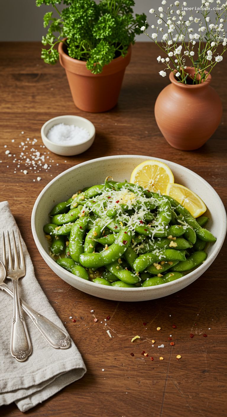Best served immediately. Refrigerate leftovers in an airtight container for up to 2 days. Reheat gently in a skillet over medium-low heat with a teaspoon of water to loosen the sauce, then refresh with a squeeze of lemon and a sprinkle of Parmesan. Freezing after saucing is not recommended (the cheese can turn grainy). If you want to prep ahead, steam the edamame up to 1 day in advance, chill, and quickly toss in hot garlic butter just before serving.