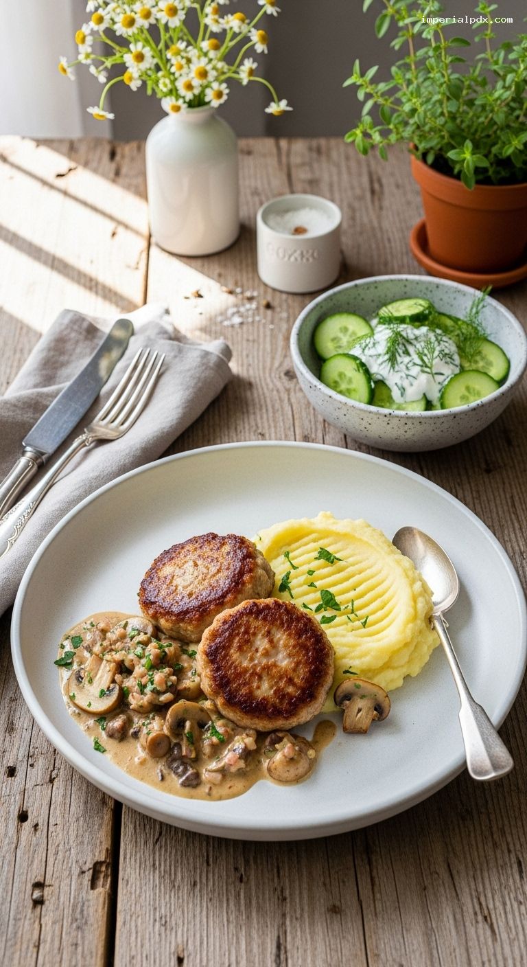 - 7. Serve patties with mushroom-cream sauce, mashed potatoes, and cucumber-dill salad. Garnish with parsley.