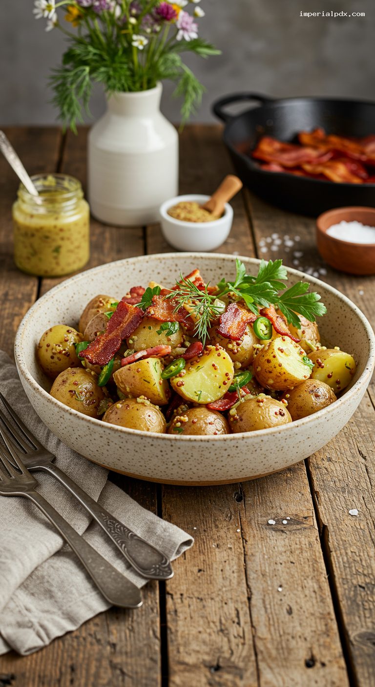 Refrigerate leftovers in an airtight container for 3–4 days. Reheat gently in a skillet over low heat with a splash of water or broth until warmed through; refresh with a spoonful of vinegar and a pinch of salt. For make-ahead, boil the potatoes up to 2 days in advance and refrigerate; prepare the hot dressing and toss just before serving. Add fresh herbs at the end to keep their color and aroma. Not recommended for freezing.