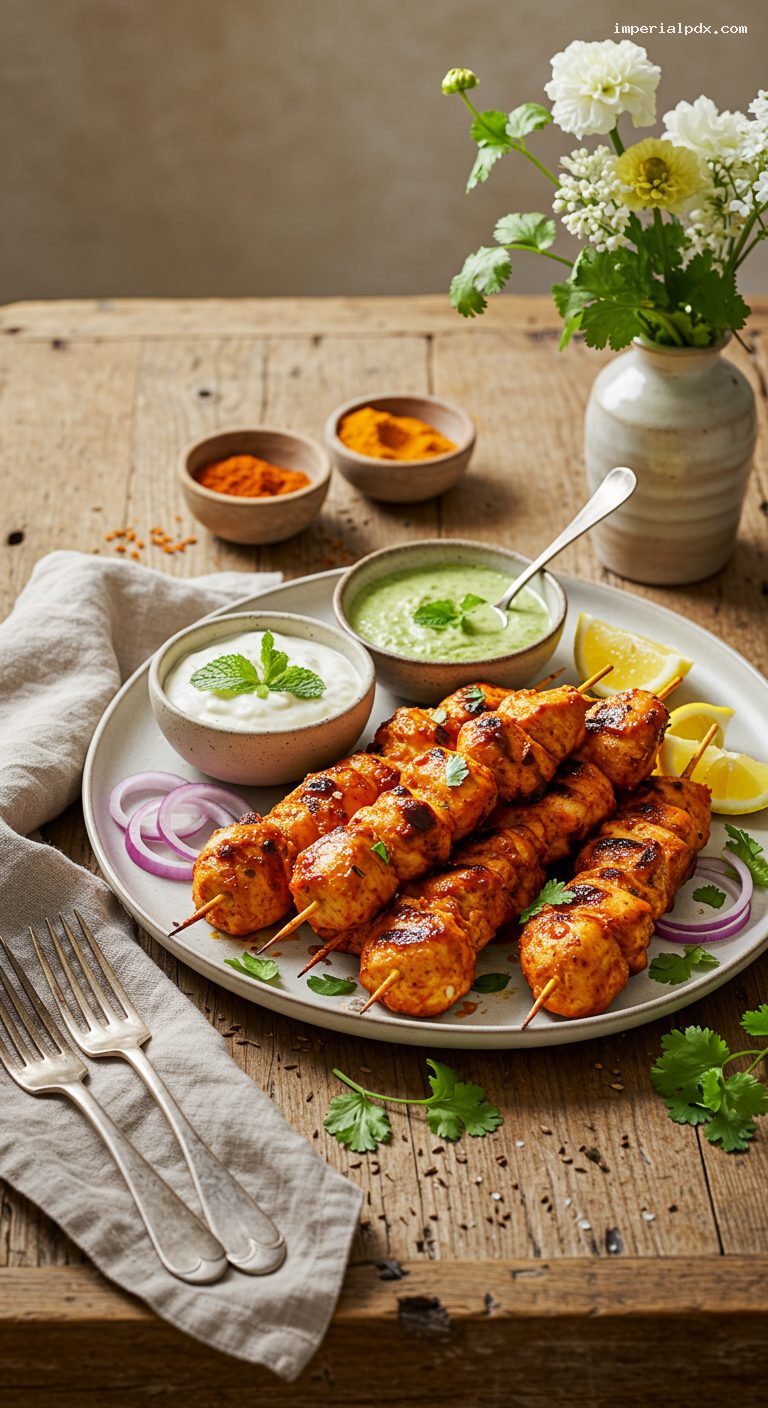 - Balanced plate: lightly charred, spiced chicken paired with a cooling mint-cilantro chutney.