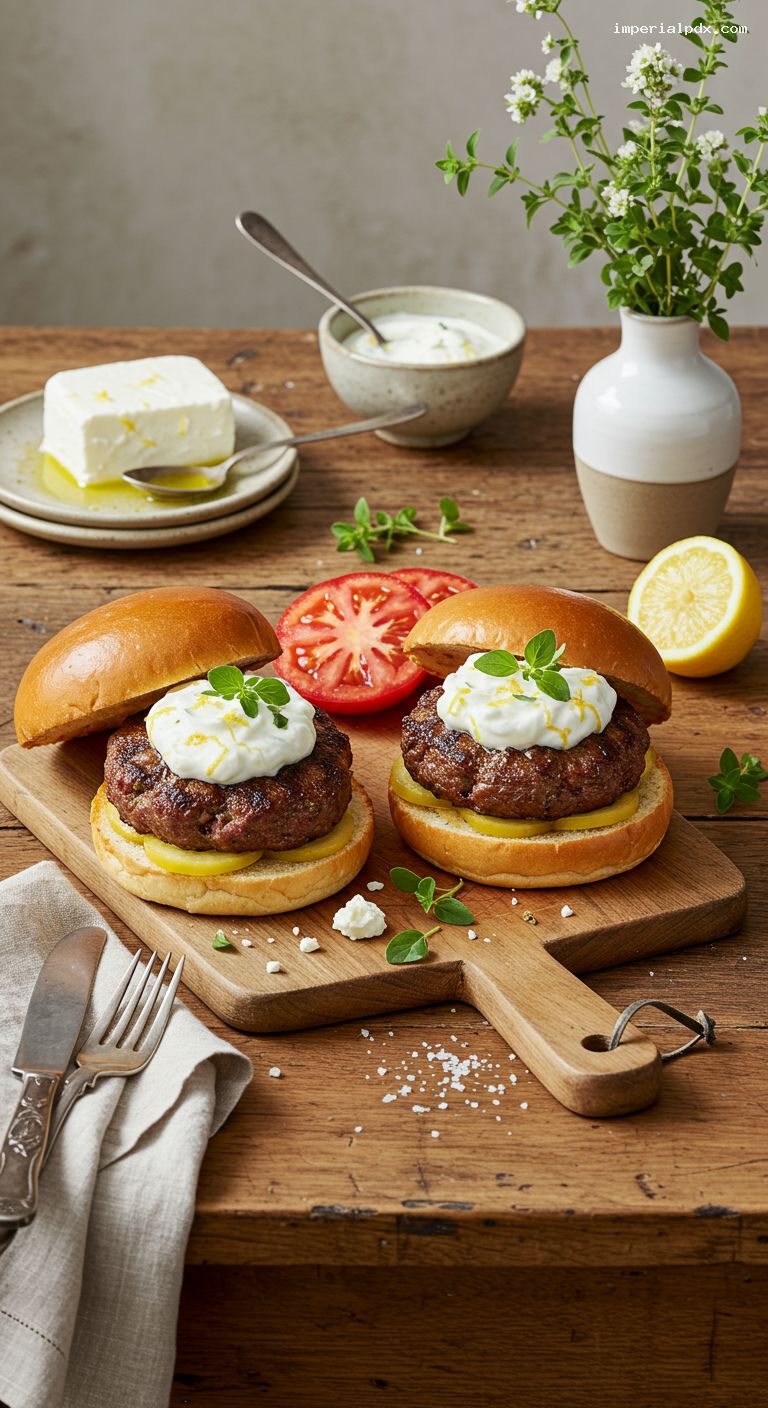 Toast buns, cut side down, 30–60 seconds until golden. Spread lemony yogurt on both cut sides. Add a patty with warm feta, top with 1–2 tomato slices (and red onion/greens if using). Add a final dollop of yogurt and close the bun. Serve immediately, with extra lemon zest or fresh oregano over the top if you like.