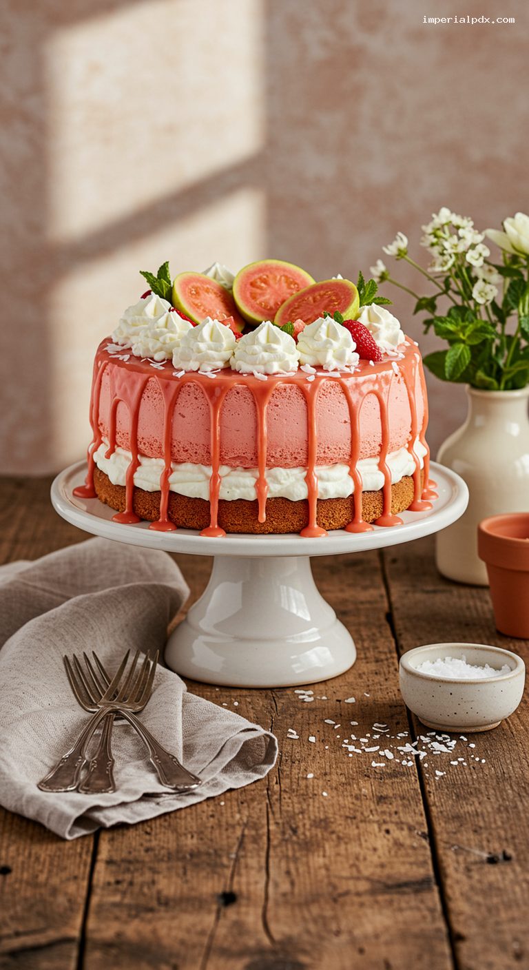 Optional brush syrup: Simmer 1/4 cup guava nectar with 1 tbsp sugar and 1 tsp lemon juice until the sugar dissolves; cool. Place one cake layer on a stand. Brush with 2–3 tbsp syrup (if using). Spread about 1 1/2 cups whipped cream evenly over the layer. Top with the second layer and brush again. Smooth a thin coat of cream over the top and sides (or leave the sides semi-naked). Spoon the guava glaze onto the center and nudge to the edges to create soft drips. Pipe remaining cream in rosettes around the rim. Garnish with fresh guava or strawberry slices, mint, and toasted coconut. Chill 30–60 minutes before slicing.