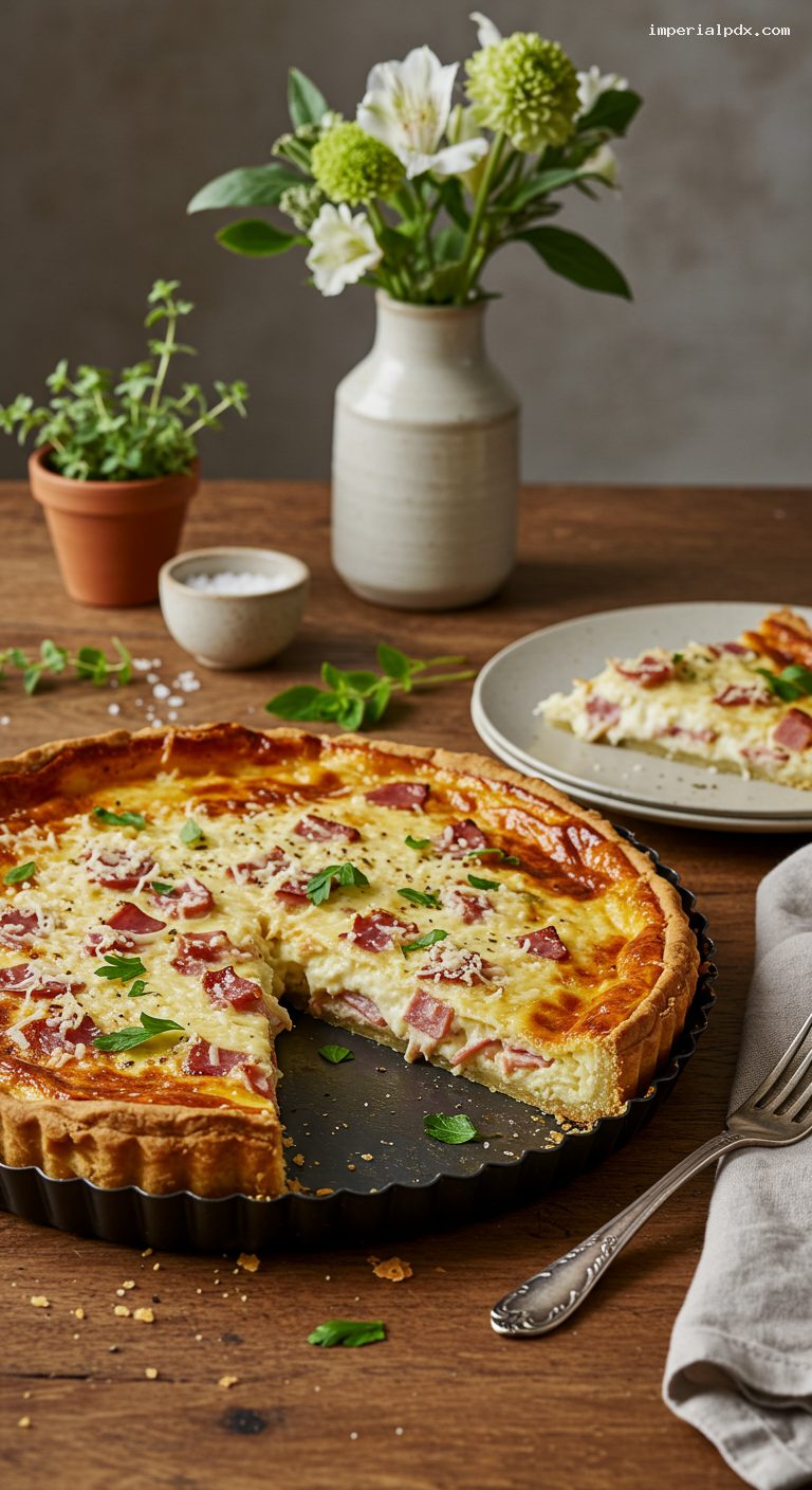 - 6. Fill crust with onion-ham, then cheeses; pour custard. Bake at 190°C/375°F for 30–35 minutes until puffed and golden. Rest 15 minutes, garnish, slice.
