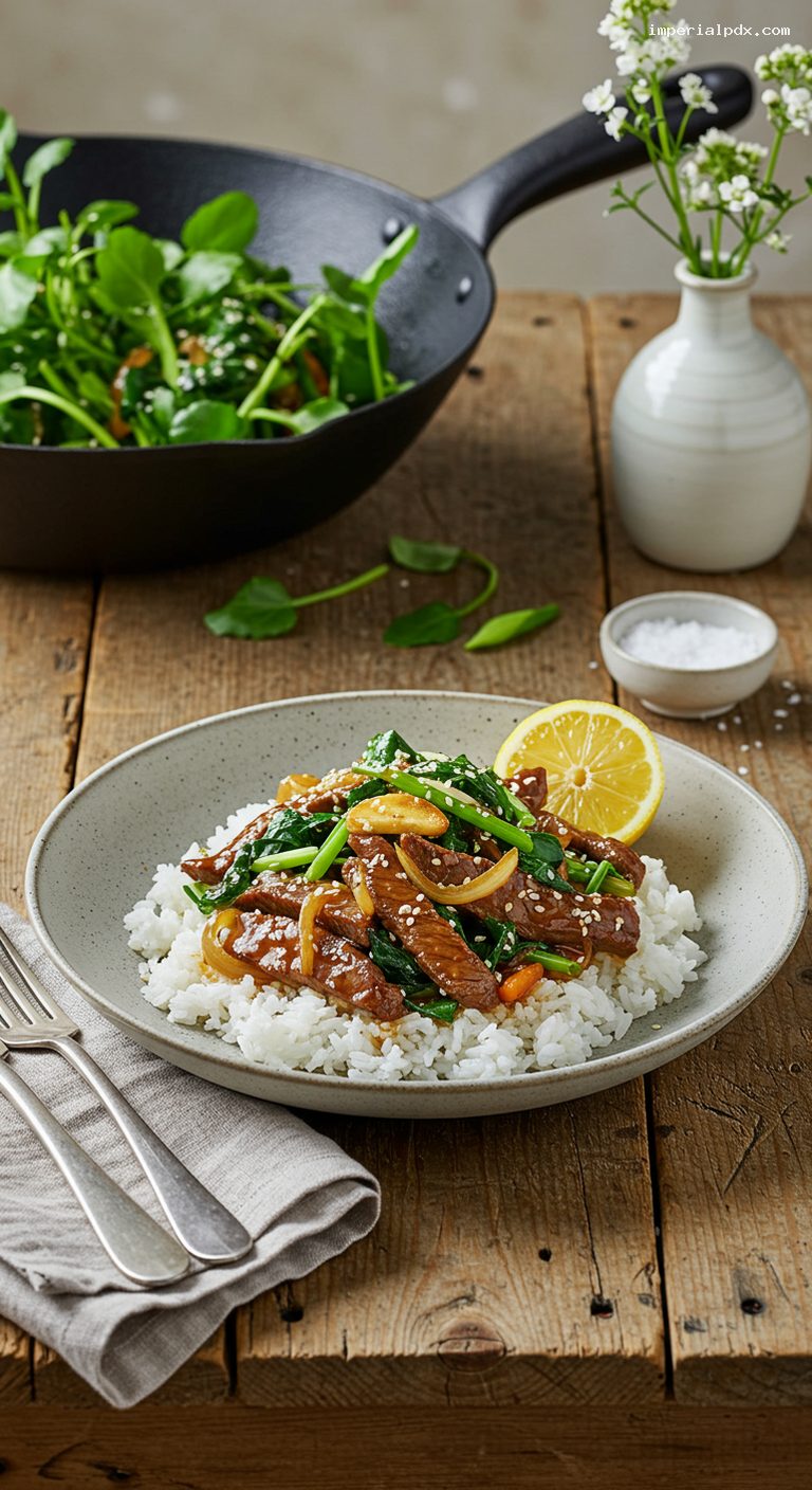 Return the beef and any juices to the pan. Stir the sauce, pour it in, and toss constantly 60–90 seconds until the gravy turns glossy and lightly thickened, coating the beef and onions. Add the watercress and cook 30–45 seconds, just until the leaves wilt and stems stay crisp. Remove from heat. Spoon over hot rice, squeeze lemon over each serving, and garnish with scallion and sesame if using. Serve immediately.