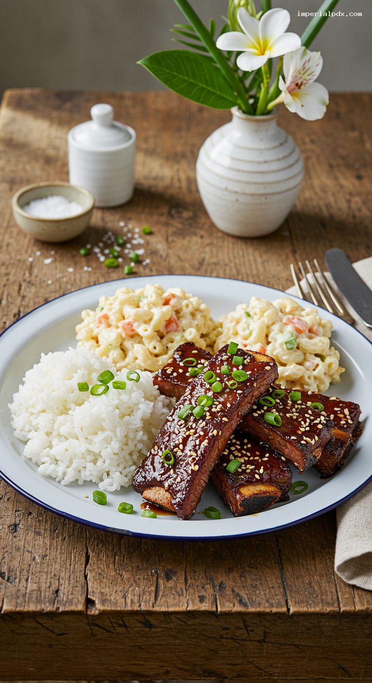 - Balanced flavors: salty-sweet-garlicky ribs, cool tangy mac salad, and neutral rice to soak up the juices.