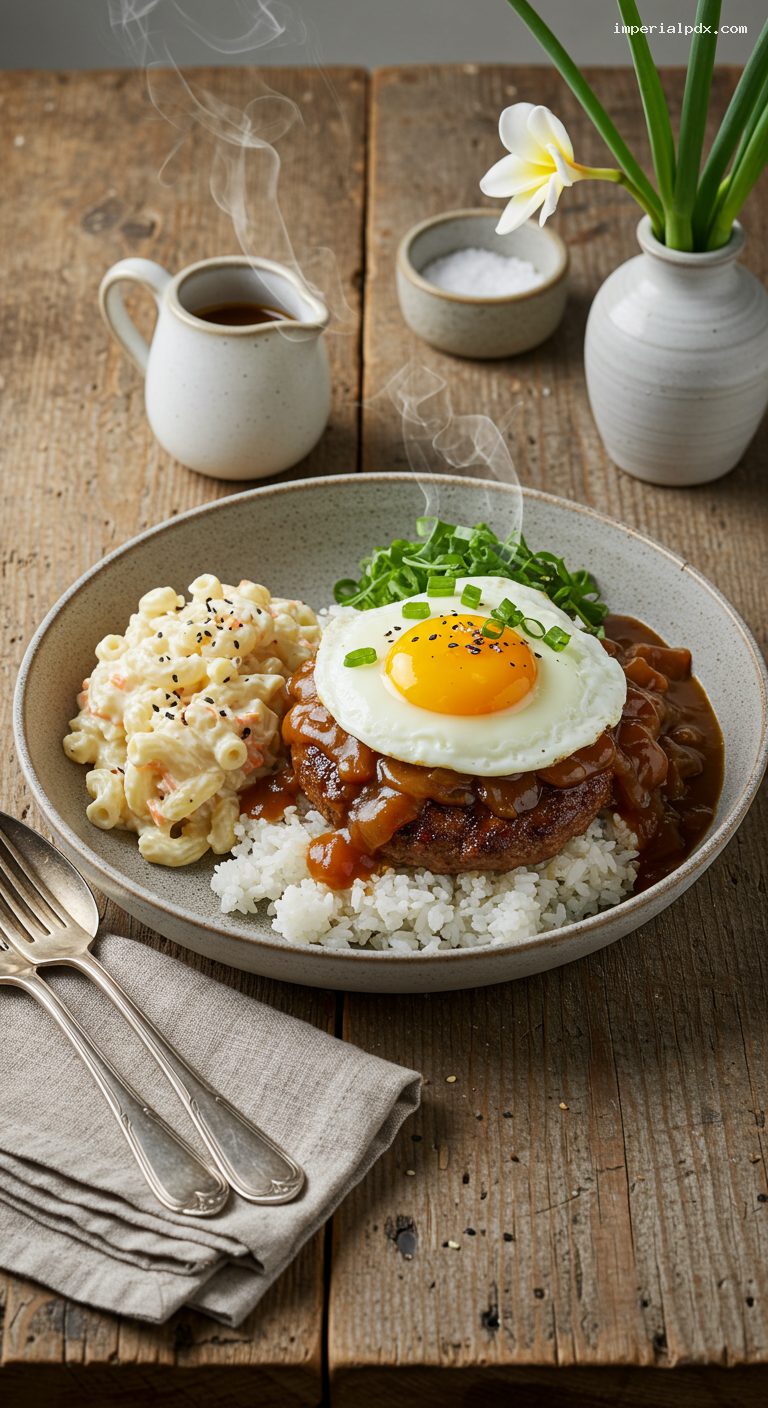 - Classic Hawaii plate-lunch comfort: juicy beef, silky brown gravy, and a runny yolk over fluffy rice.