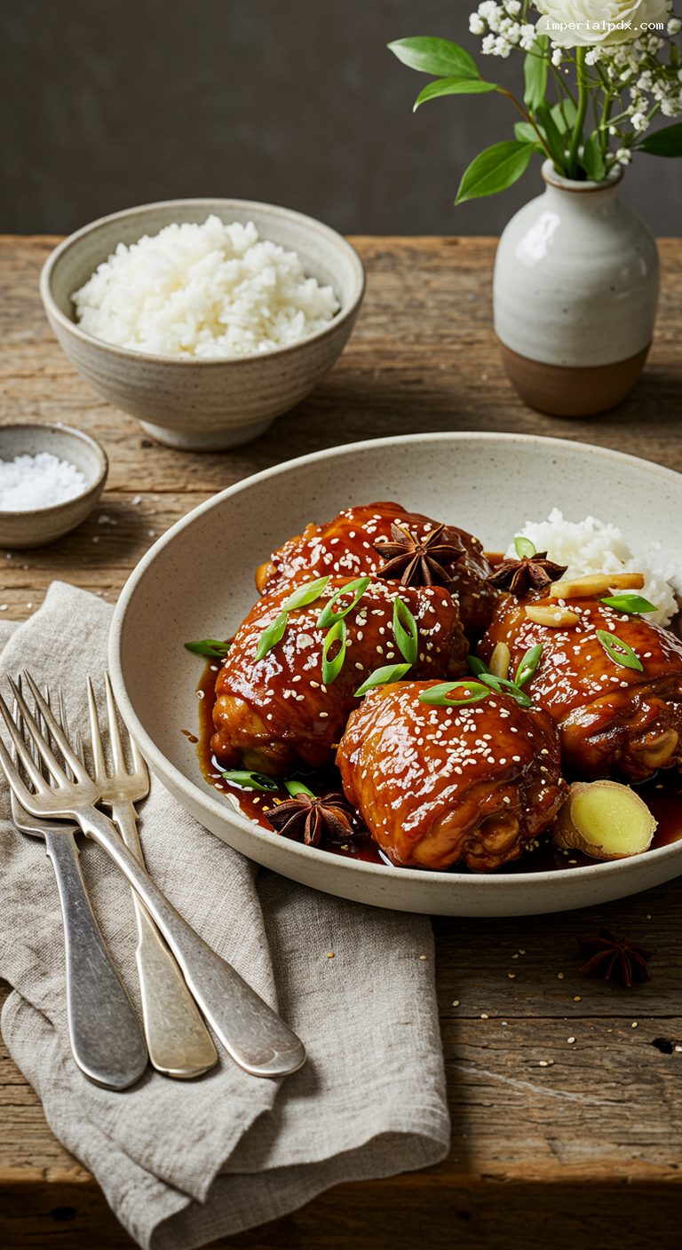 Remove the lid, add the rice vinegar, and raise the heat to medium. Let the sauce simmer uncovered for 10–12 minutes, turning the chicken once or twice, until the liquid reduces by roughly half and turns glossy, coating the back of a spoon. If you prefer a thicker glaze, stir in the cornstarch slurry during the last 2 minutes and simmer until shiny and slightly syrupy. Remove and discard star anise.