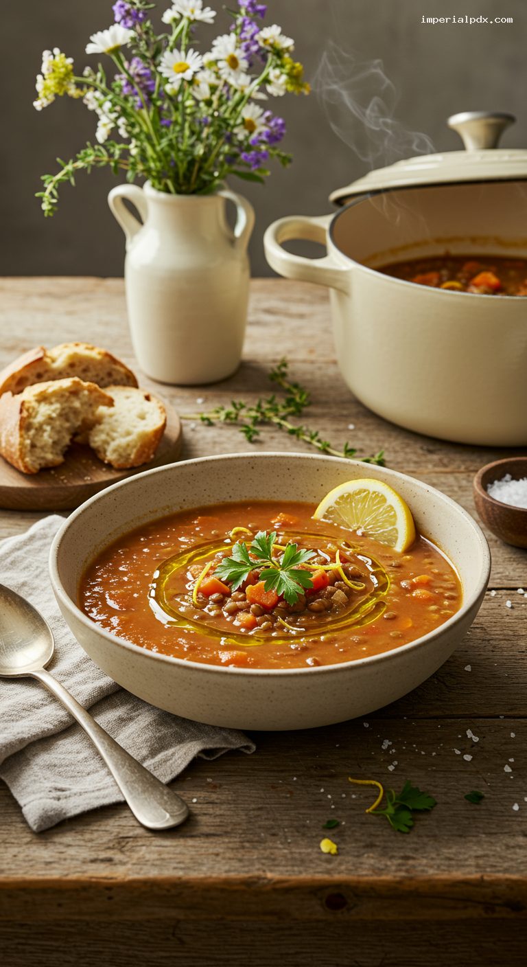 - Pantry: Brown lentils, tomato paste, canned diced tomatoes, low-sodium vegetable broth, extra-virgin olive oil, bay leaves, dried thyme, fine sea salt, black pepper, red pepper flakes (optional), crusty bread