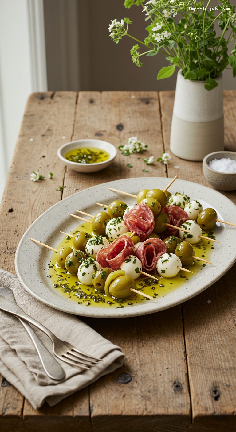 - 4. Thread 20 skewers: olive → folded salami → marinated mozzarella → pepperoncini piece → artichoke heart.