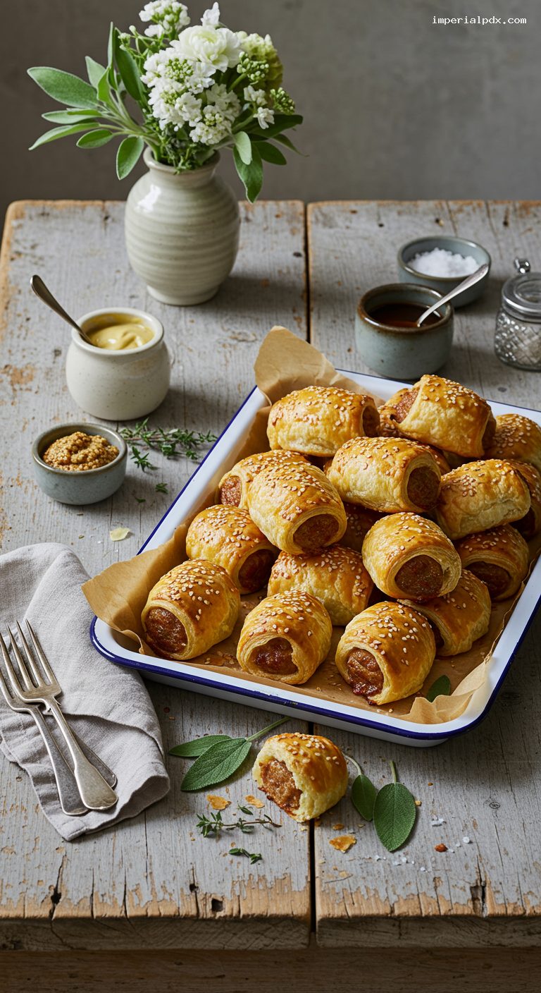 Let the rolls rest 5 minutes to set the juices. Serve warm with English mustard or brown sauce. The contrast of sharp mustard or tangy brown sauce with buttery pastry and savory pork is classic and perfect.