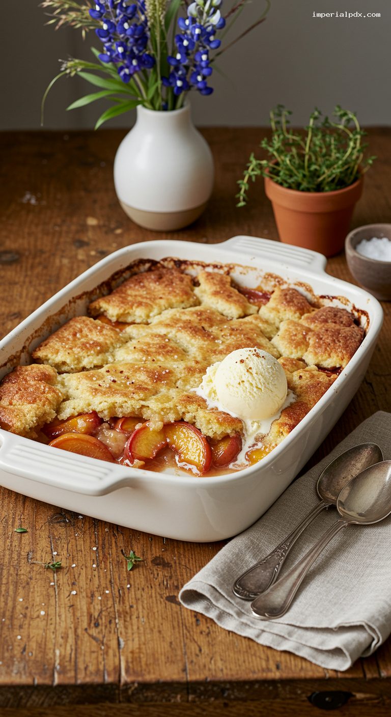 Cool on a rack for 10–15 minutes—the cobbler will set and the edges will get even crisper as it rests. Serve warm in shallow bowls with a big scoop of vanilla ice cream and a drizzle of any reserved peach juices.