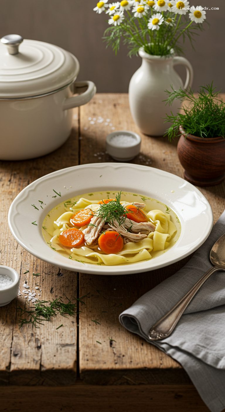 - 7. Portion noodles and chicken in bowls; ladle hot broth and carrots; top with dill and pepper.
