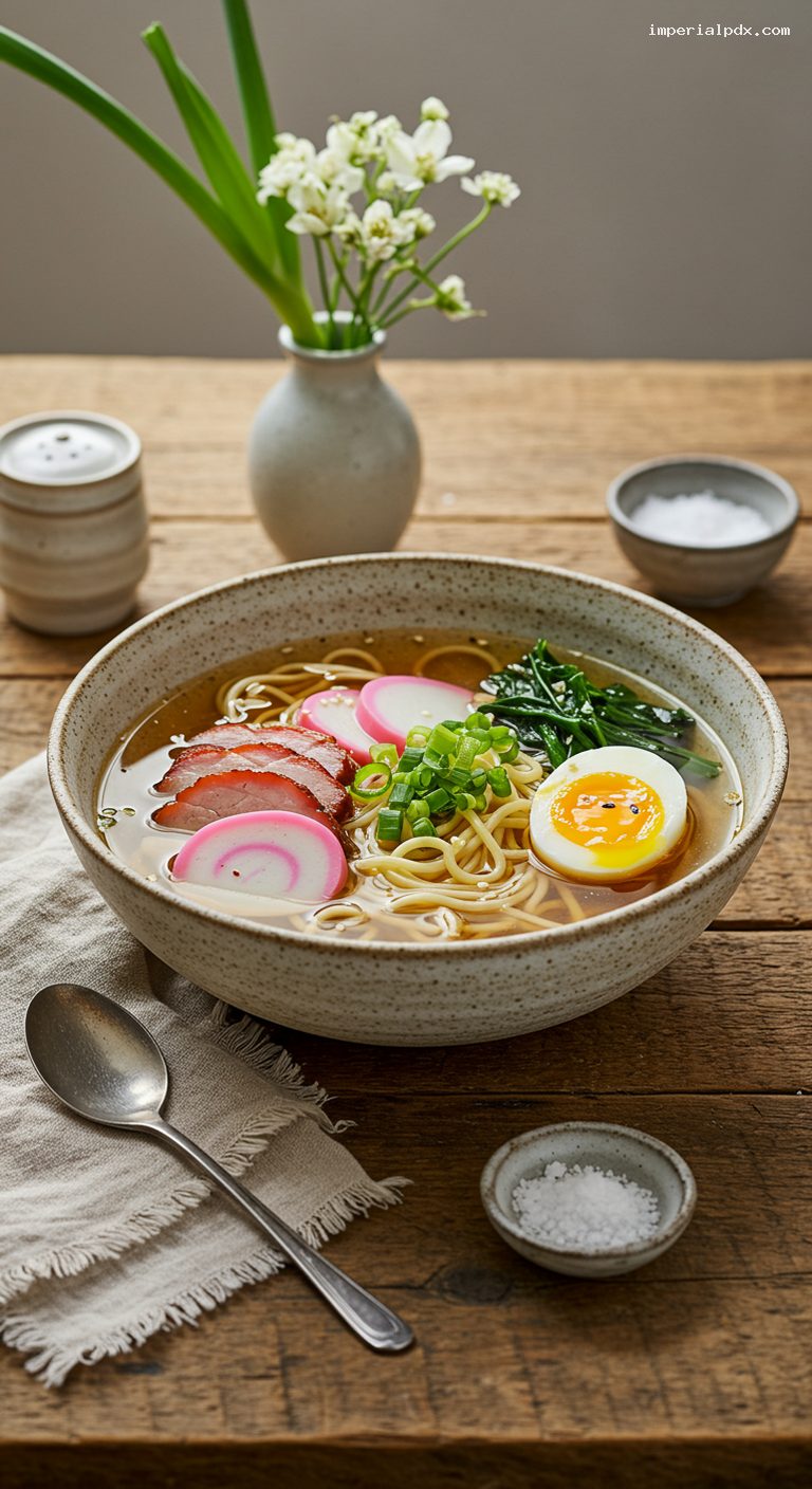 - 6. Divide noodles into bowls. Ladle in hot broth. Top with char siu or Spam, kamaboko, green onions, and the soft egg. Serve immediately.