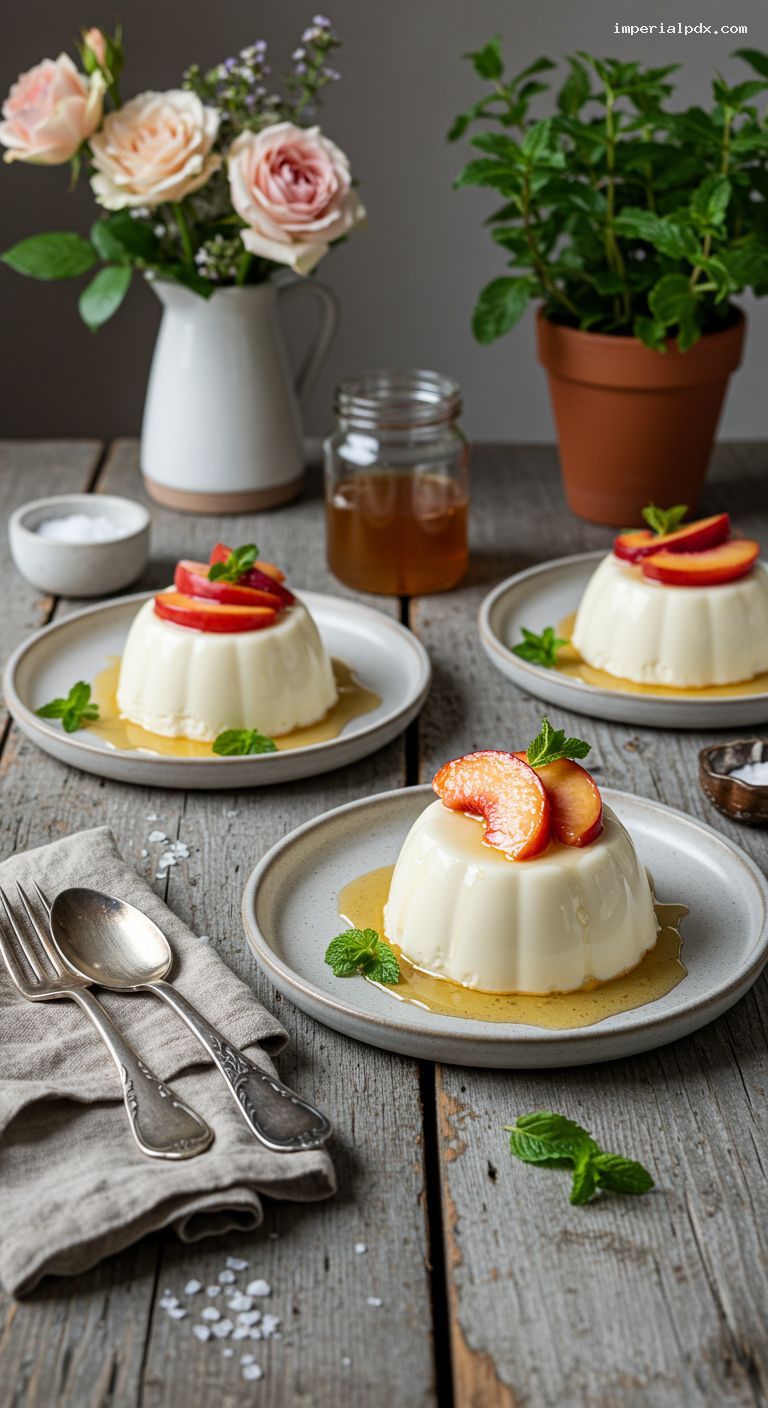 - 7. Serve: Unmold panna cotta, spoon peaches and their juices on top, drizzle warm honey, garnish with mint.
