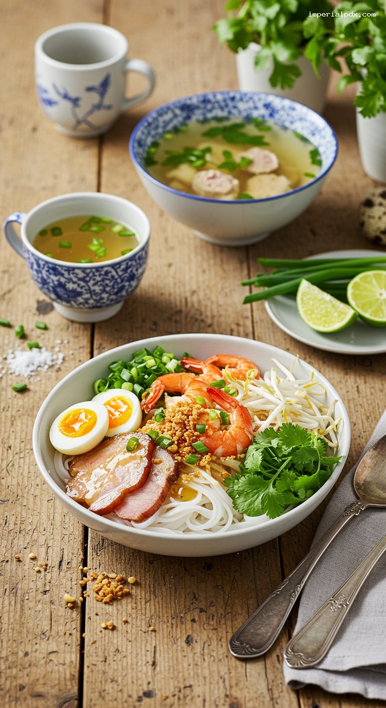 - 7. Dry bowls: toss noodles with dry sauce; top with meats, shrimp, quail eggs, sprouts, chives, fried garlic; serve hot broth on the side. Soupy bowls: noodles in bowl, add 2 cups broth, then toppings.