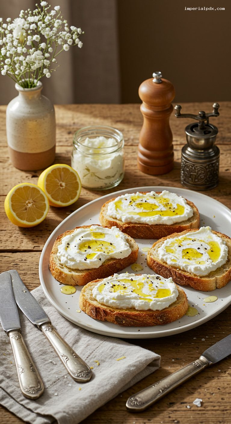 - 3. Whip ricotta with 1 tbsp olive oil, 1 tsp lemon zest, 1/4 tsp kosher salt, and 1/4 tsp cracked pepper until silky.