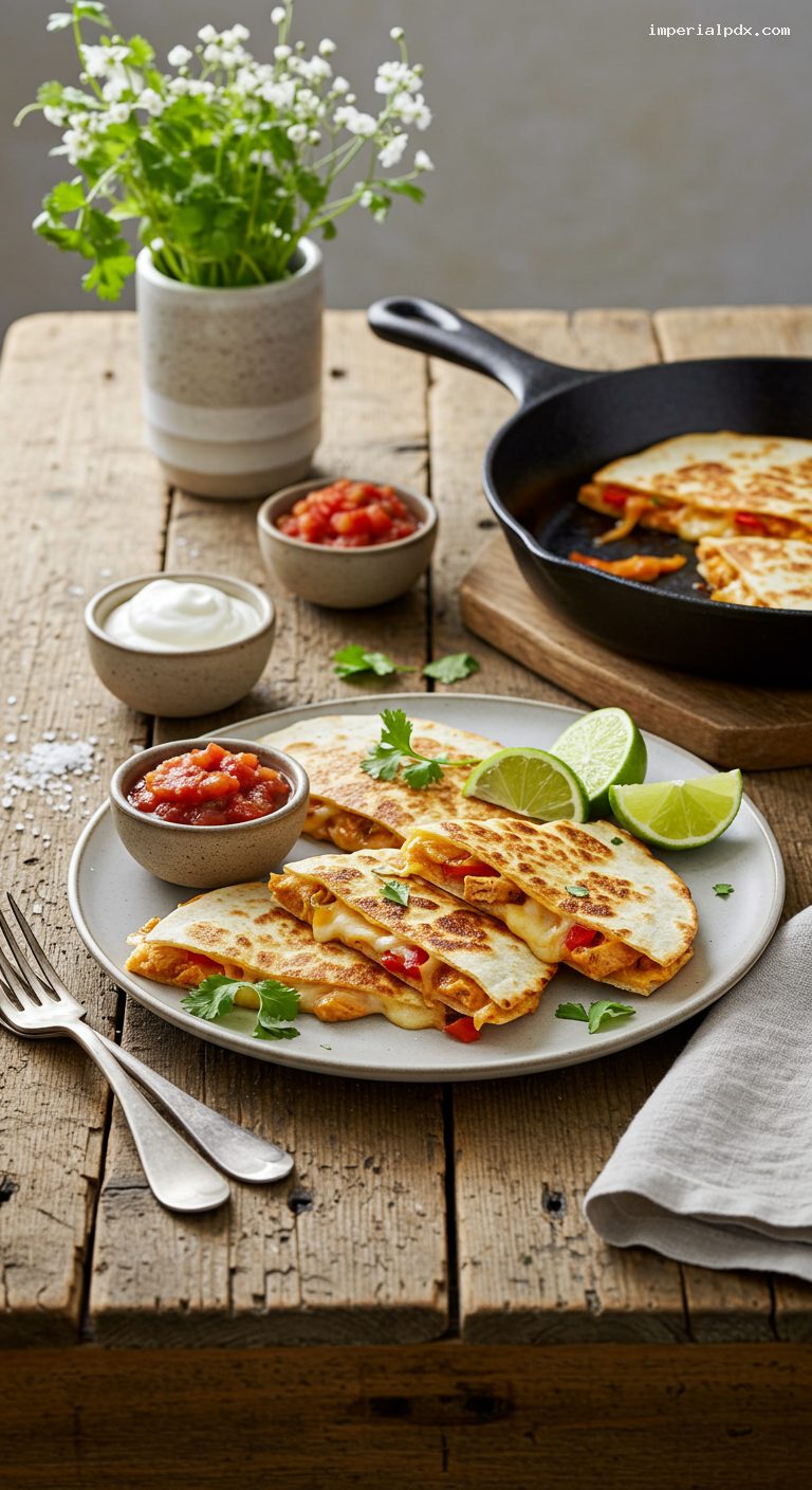 - Sheet-pan option: Assemble quesadillas on a parchment-lined sheet and bake at 425°F for 8–10 minutes, flipping once, for a hands-off approach.