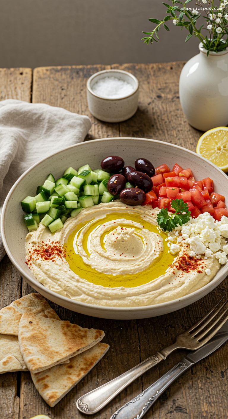 Hummus keeps well in an airtight container in the refrigerator for up to 5 days. Stir before serving; if it thickens, loosen with a tablespoon of cold water or lemon juice. Store chopped toppings separately for up to 24 hours to keep them crisp. Pita can be wrapped and refrigerated for 2 days or frozen for up to 1 month; rewarm at 350–375°F for 5–7 minutes.