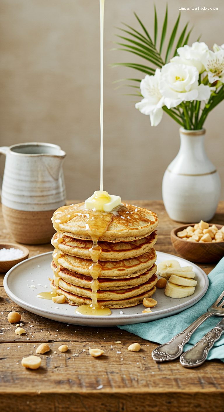- Fluffy, tender pancakes with buttery macadamia crunch in every bite.
