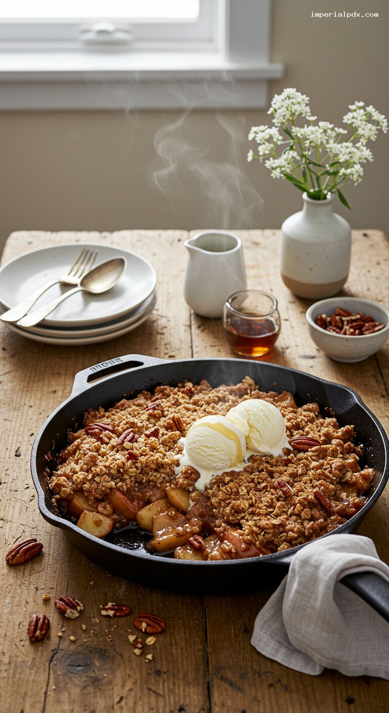 Let the crisp rest for 10 minutes so the juices thicken. Spoon into bowls while warm. Top each serving with a generous scoop of vanilla ice cream and, if you like, a light drizzle of maple syrup. Serve immediately.