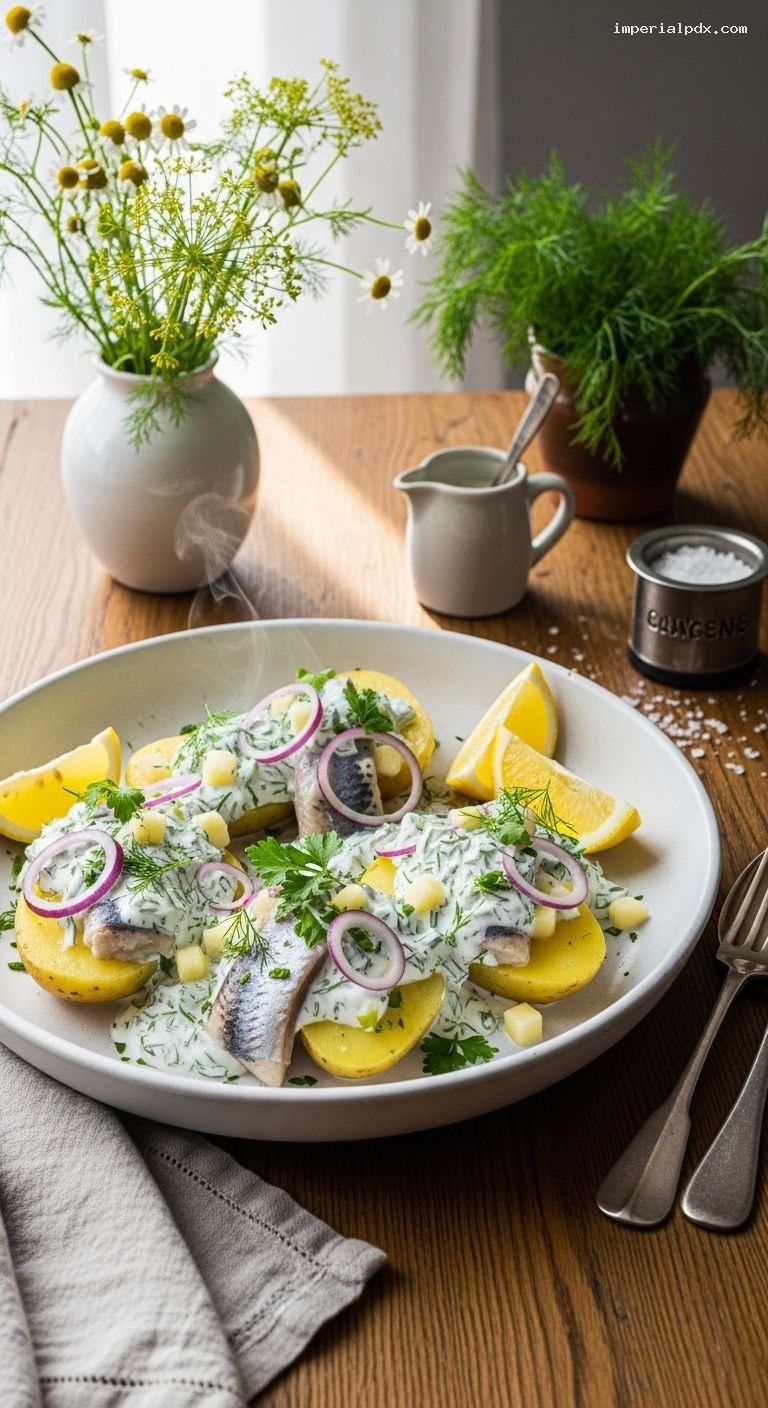 - Classic northern German comfort: cool, creamy, herby matjes over hot, buttery potatoes.