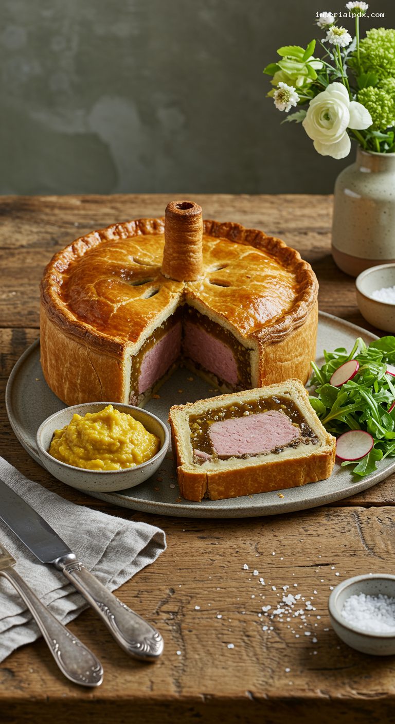 - True hand-raised hot-water crust with a golden, crimped finish—no tin required.